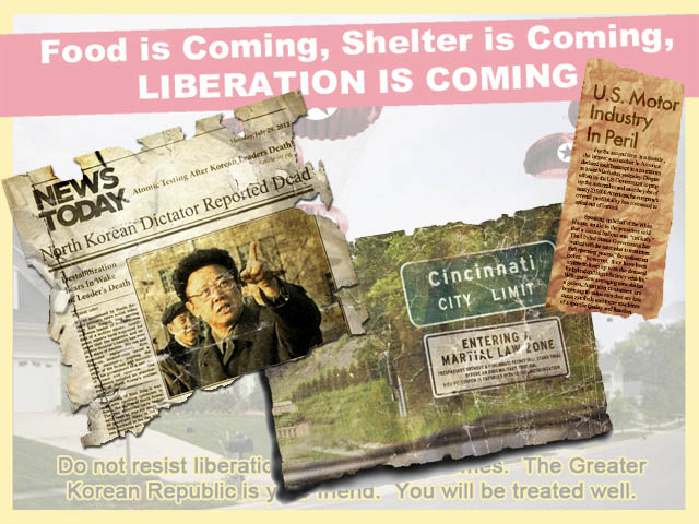 Algunos de estos sucesos, como puedan ser, la muerte de Kim Jong-il en el año 2012 o la industria del motor troncada en esa misma década. En el 2019, la declaración de la ley marcial en el medio-oeste. Epidemias de fiebre debido a un servicio de salud arruinado, y la propaganda de la invasión… todo esto, Historia futura.