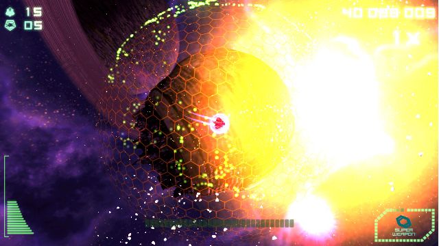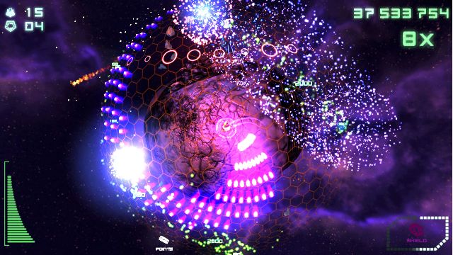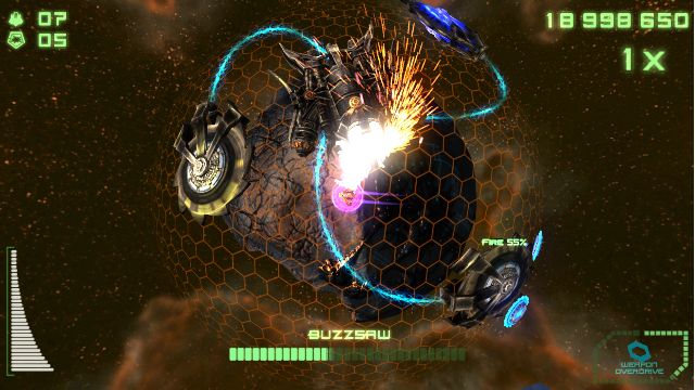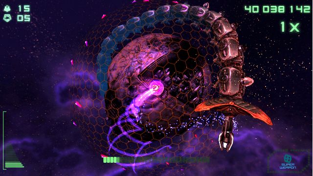 Como ya habéis leído las posibilidades de ataque por nuestra parte son variadas, yendo armado hasta los dientes, ya que la nave poseerá ataques estándar de varios tipos, los cuales afectarán más a algunos enemigos que a otros, y unos ataques especiales los cuales varían entre crear un agujero negro el cual absorba a gran parte de los enemigos en pantalla y por otro lado un ataque con misiles teledirigidos que no rodeará… tremendamente devastadores. Por último aunque no es un arma, tenemos el turbo el cual al pulsarlo nos moveremos a gran velocidad con inmunidad, pudiéndonos traslada a otro lado del planeta y escapar con ello de algunos marrones. Además si a todos ellos le sumamos la posibilidades de mejoras de potencia y velocidad que os hemos comentado que nos dan, nos encontramos ante una variedad de posibilidades de ataque bastante interesante.