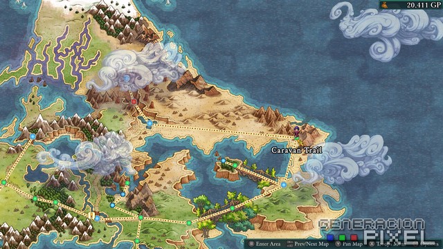 Ya fuera del campo de batalla, nos encontramos con un mapeado más simple y conceptual, por el nos podremos ir moviendo por los caminos prefijados con alguna que otra variación de ruta, y emplazamientos que visitar, los cuales se irán desbloqueando y apareciendo a medida de que nuestra aventura vaya avanzando y cumpliendo con ello en el campo de batalla.