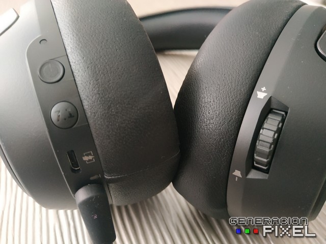 En sus orejeras volvemos a encontrarnos con los mandos de control de estos. Por un lado una buena ruleta de control de volumen de audio, y en la otra orejera, el conector de carga usb, el puerto para incrustar el micrófono, el botón de encendido y apagado, el cual tenemos que volver a criticar, ya que nos ha parecido que se podía haber mejorado su accesibilidad, ya que sigue costando encontrarlo con el simple tacto, incluso aunque haya pasado a ser plano.