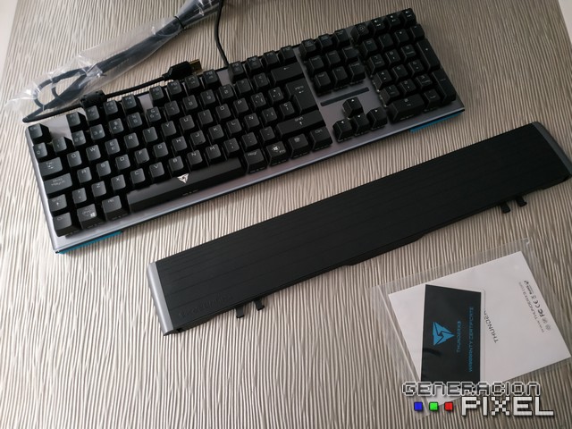 En lo que respecta a lo que encontramos dentro de la caja; hay que contar que nos encontramos con el propio teclado, el reposamuñecas, y una pequeña bolsa con un manual de instrucciones y una pegatina de la marca. La verdad que bastante completo.