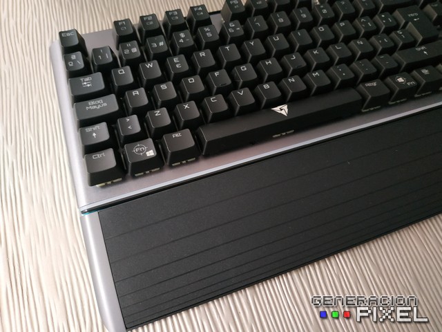 Por un lado, la ergonomía del teclado. La cual nos ha dejado muy satisfechos en tres puntos muy reseñables. Por un lado el ángulo de inclinación que este posee, el cual es incluso modificable un poco (6O) más con la inclusión de sus pequeñas patas. Por otro lado, el perfil de este tiene la justa medida para no hacernos levantar especialmente las muñecas a la hora de utilizarlo, permitiéndonos tenerlas pegadas al escritorio sin ninguna movilidad extraña. Y por último, y directamente relacionado con lo anterior, está el reposamuñecas, el cual nos permite más aún el poder descansar nuestras manos mientras escribimos, y que por su tamaño, material e inclinación nos ha parecido esencial y muy agradable de colocar.