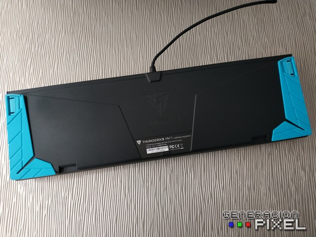 Por lo que se refiere a los materiales, hay que decir que el teclado está realizado por completo en plástico de alta calidad, con diferentes texturas. Y una base en la que nos encontramos con uno de los puntos más interesantes del este teclado, que es su base de goma antideslizante que fija perfectamente el teclado a la mesa, y sus respectivas patas extraíbles en material plástico que dan una pequeña inclinación a este.