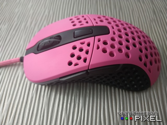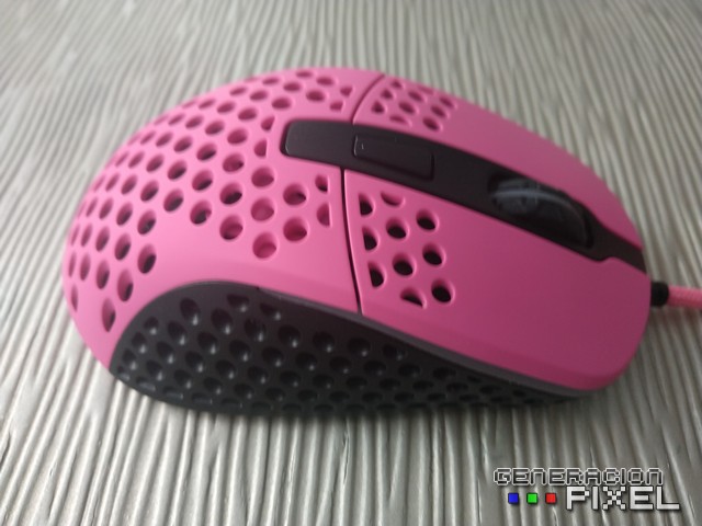 Ya con el ratón sobre nuestra mesa de pruebas, lo primero que resalta es sin dudarlo el agujereado de toda la superficie de este, el cual, si os preguntáis que función tiene, no es otra que la reducir el peso y, por otro lado, mejorar la aireación de la palma de la mano. Y claramente lo consigue, eso sí, con tacto que va a depender de gustos.