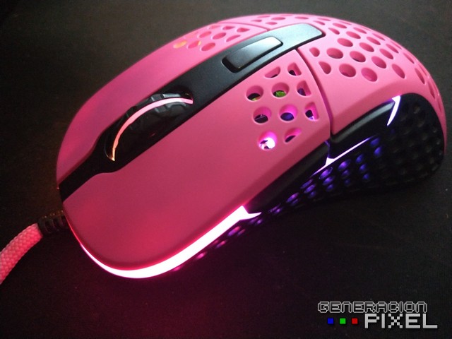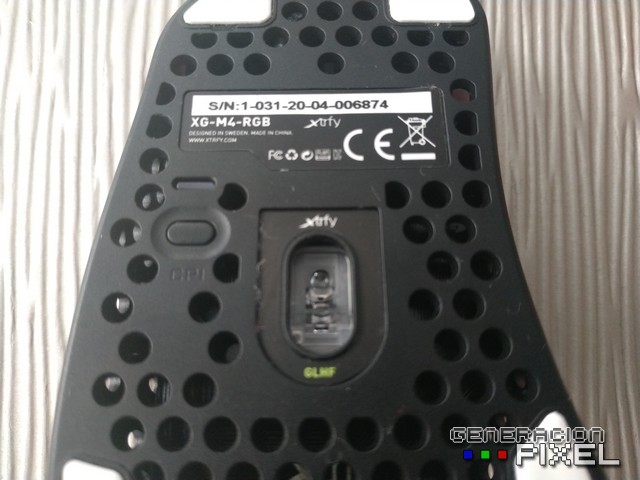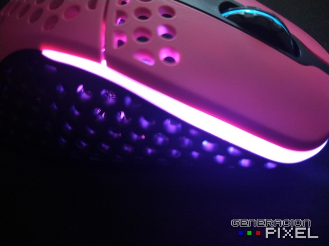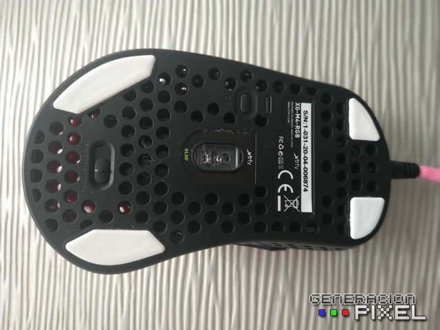 Más allá de esos agujeros, y en lo que a diseño se refiere, es un ratón de corte estándar, que llega en diferentes colores, no especialmente alto en su cuerpo, con la doble botonera superior, y un botón de opciones de iluminación en la parte superior tras la rueda de scroll. En el lateral izquierdo os vais a encontrar con dos botones de un tamaño considerable y muy accesibles. Y una parte inferior donde sus cuatro bien colocados surfers de PTFE, estarán acompañado por el sensor en la parte centrar, y algunos botones de funciones que ya os explicaré.