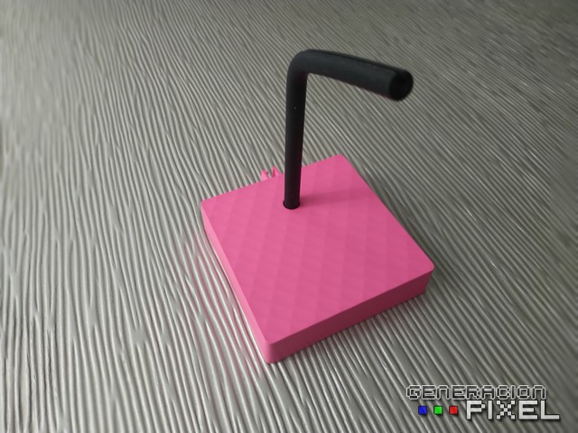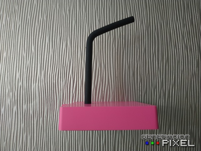 Estéticamente es muy bonito dentro del minimalismo que muestra. Ya que posee una base metálica con forma cuadrada con las esquinas redondeadas, y un soporte de material de silicona flexible. La parte inferior de soporte posee una goma antideslizante que fija aún más el producto a nuestra mesa. Por cierto, esta base la hay en varios colores, como veis, he tenido en mi poder la rosa, que es una auténtica chulada, y en la que encontraremos el logo de la marca bien impreso en un lateral.