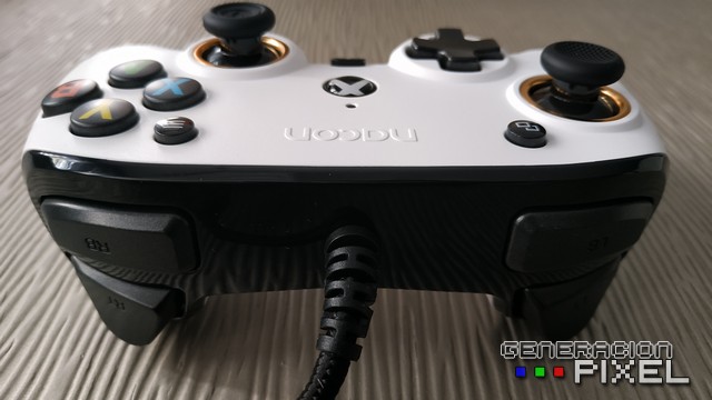 En la parte trasera no podían faltar los gatillos. Estos son de un material bastante pulido. Con un buen tamaño y colocación. Y con un más que correcto tacto a la hora de su pulsación. Además de ahí saldrá la conexión de cable del que os hablo a continuación.