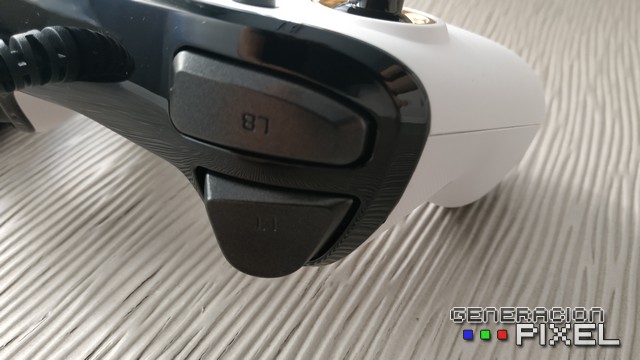 En la parte trasera no podían faltar los gatillos. Estos son de un material bastante pulido. Con un buen tamaño y colocación. Y con un más que correcto tacto a la hora de su pulsación. Además de ahí saldrá la conexión de cable del que os hablo a continuación.
