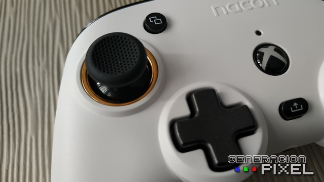 La parte superior es en la que encontraremos los dos sticks recubiertos en goma y pulsables colocados de forma asimétrica. Con un tacto y una movilidad muy buena. Una cruceta bastante común y con buen tacto. Cuatro botones ABYX en colores de un tamaño mayor a lo habitual. Además, posee varios botones más centrados en opciones del mando como son; un botón de view, uno de menú, uno central con el logo de Xbox, y el siempre agradecido de share. La verdad que por botones y posibilidades no va a quedar.