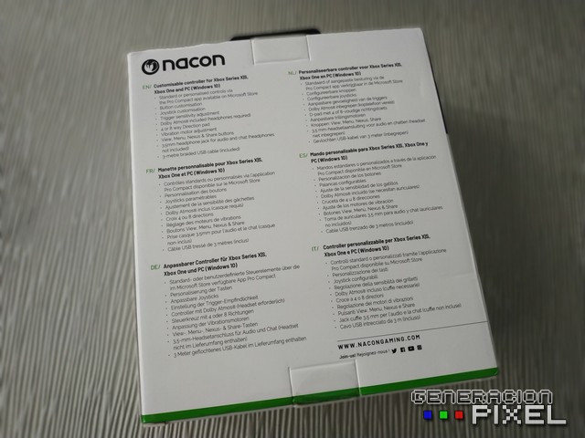 Empiezo como no podía ser de otro modo con la presentación de cara al público de este producto. Y la verdad que Nacon ha vuelto a plantear una estética moderna y sobria. Dejando claro que están centrados en hacer productos de calidad, más que en realizar una promoción llamativa. Por esto, os vais a encontrar con una pequeña caja con los colores clásicos de la consola de Microsoft. Y en la que podréis ver una imagen frontal del producto. Y gran cantidad de datos y características que nos esperan dentro de la caja y desde el punto de vista técnico del producto. Así que una interesante presentación. Bien tratada. Y de aspecto bastante minimalista.