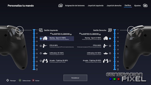 Respecto a la hora de conectar el mando, tanto en PC como en Xbox. Esto se realiza de forma muy sencilla. Y es perfectamente jugable nada más conectarlo al puerto USB. Eso sí, como siempre suelo recomendar, y más en un caso como este, es la instalación en PC del software de este. Siendo realmente bueno y variado. Pudiendo realizar adaptaciones y personalizaciones, entre una cantidad ingente de posibilidades que nos permiten gestionar; gatillos, ángulos de movimientos, presión, la movilidad de los stick, las botoneras y sus funciones, y decenas de cosas más que lo permiten poner a punto para cualquier tipo de juego y jugador.