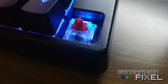 Las teclas poseen los switches Cherry Mx Red. Unos pulsadores con un tacto realmente especial que se adapta a la perfección tanto al gaming como a la escritura. Se les agradece que no sean demasiado ruidoso por su tipo de contacto. Además, su posibilidad de extracción viene genial como siempre para la limpieza.