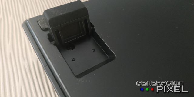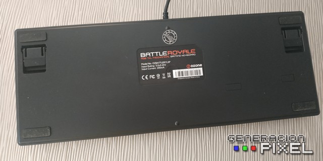 En la parte inferior, nos topamos con un diseño simple. En donde vemos cuatro zonas antideslizantes en cada una de las esquinas. Y dos patas abatibles, que nos permiten dar inclinación al teclado en dos alturas. Y que consiguen estas y sus engomados crear un teclado bastante estable.