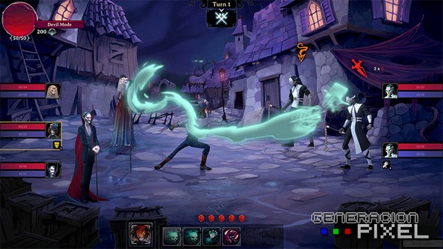 Pero la cosa no queda ahí… ciertamente por posibilidades jugables este Rogue Lords, no queda. Eso sí, vuelvo a reseñar, que cuesta entenderlas y entrar en las primeras partidas. Y es que ahora os tengo que hablar del modo diablo. El cual nos permite entrar en una dimensión paralela. En la que gracia a una barra de esencia, cambiaremos totalmente los conceptos del combate. Y en el que destaca la posibilidad de transferir estados de nuestros personajes o enemigos entre ellos. E incluso manipular las barras de energía y espíritu. Una nueva capa del combate que sigue aumentando en dificultad su bases jugables..