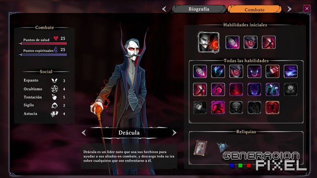 Otros puntos curiosos, dentro de estos puntos roleros. Son por un lado el Terror. Un concepto que nos irá ir subiendo de nivel y dando acceso a nuevas reliquias, a la vez que no dará una serie de ventajas cada vez que se cumpla una serie de noches. Y un curioso sistema social de rasgos con bonificaciones y penalizaciones.