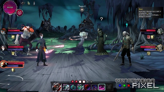 Me ha parecido realmente interesante lo bien implementadas que están las habilidades en cada uno de los personajes. Siendo interesante montar y gestionar un buen equipo. Ya que las funciones de estas pueden ser realmente variadas y complementarias. Y en la que los puntos de acción van a depender mucho de sus utilizaciones. Por lo que recargar, gestionar los tempos y turnos, y saber cuándo y con quien usarlas es una importante y esencial tarea para seguir adelante.