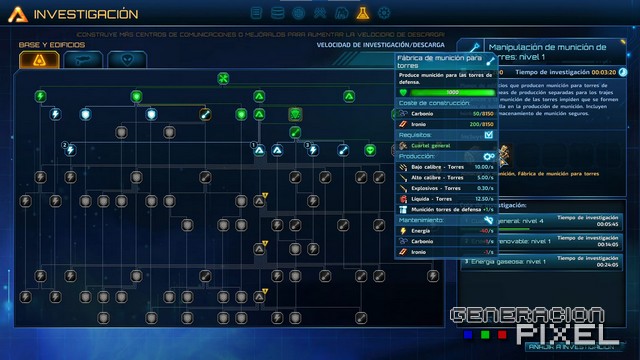 Empezando por la parte que corresponde a la construcción de bases. hay que decir que es bastante sencilla y asequible gracias especialmente a los buenos tutoriales que posee. Aunque, por otro lado, realmente profunda y llena de posibilidades. En la que destaca gran cantidad de tipos de edificios y complementos para nuestra base. Cada uno de ellos centrados en ciertas labores que van desde la recolección de recursos pasando por la manufactura hasta los que se centran sencillamente en la parte bélica de este juego. Y dónde una más qué buena, detallada y amplia interfaz, consigue darnos todo tipo de accesibilidades a las edificaciones, y demás necesidades que posea a nivel energético o estructural.