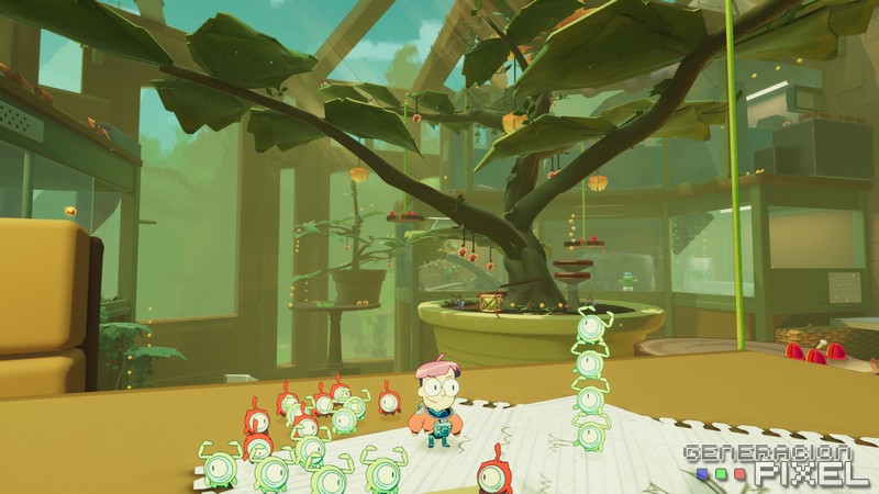 Entrando ya al particular universo de Tinykin. Está más que clara, siendo lo primero que se te viene a la cabeza, la cuestión de inspiración jugable. Y es que este, basa su jugabilidad en la concepción de varías amplias zonas unidas por un nexo central. En la que un gran base como puzle de entorno. En el que buscar objetos, saltar plataformas, y ante todo, la utilización de unos pequeños seres, de variados colores, características y cantidad, nos serán de obligatoria necesidad para superar los diferentes escollos que se nos crucen en cada sección del juego.