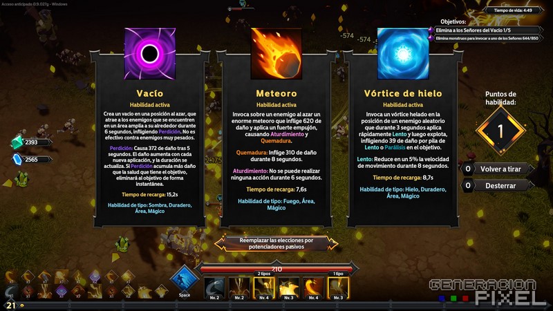 Aquí es donde entra el universo de armas, poderes, potenciadores y mejoras de habilidades. Un sistema que va relacionado directamente con la subida de niveles, y la recolección de una serie de piedras doradas que irán dejando atrás los enemigos al morir, y que nos sirven como experiencia. Y es que en ese momento nos comienza a dar el juego opciones de ataques, defensa y potenciadores de estos, entre un sin fin de opciones llenas de porcentajes y cualidades que nos dan un segundo de respiro para saber qué implementar y que sinergia puede venir mejor respecto al tipo de juego que queramos llevar adelante. Así que iros preparando para hacer cálculos rápidos, dentro de una pausa. Llevando adelante auténticas locuras, con la mezcla de cinco ataques y decenas de potenciadores acumulables. Donde el área, la dirección de ataque, o los efectos, van a ser parte importante de cada uno de ellos… entre otros muchos puntos.