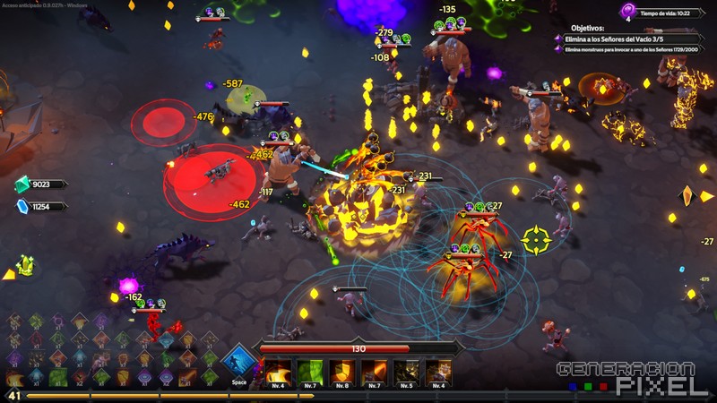 Para el que nunca haya visto o jugado un juego de este tipo. Este se basa en una concepción rolera llena de acción, en la aparecemos en un decorador delimitado en este caso. En el que iremos recibiendo hordas de enemigos infinitas a medida que vamos subiendo de nivel. Y todo con el objetivo marcado de sobrevivir, y destruir un total de cinco grandes jefes que irán apareciendo, en este caso, tras eliminar una cantidad exacta de enemigos.