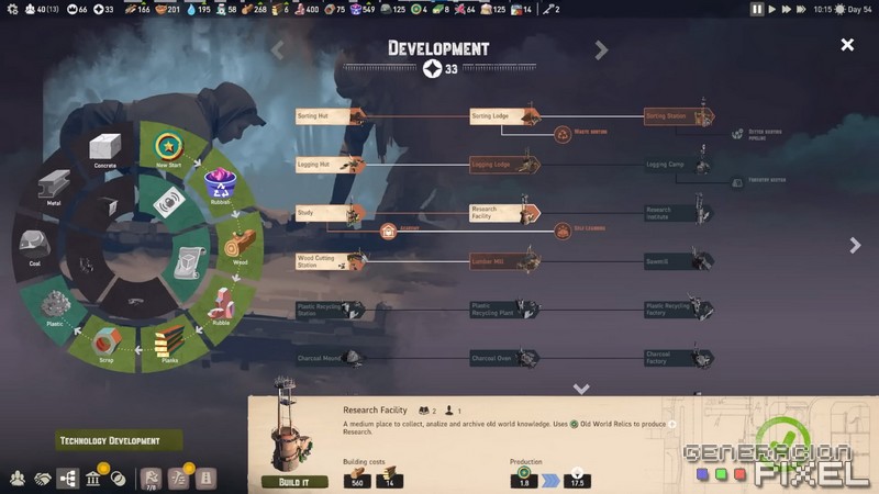 Por otro lado, deciros que el sistema de construcción y de gestión de recursos es muy ágil y accesible gracias a su buena interfaz. Estando directamente relacionado con un árbol de investigación muy bien implementado y esquematizado. Cosa que nos expande fuertemente todas las posibilidades de este nuevo mundo. Con edificaciones que saben gestionar, dar cobijo o servicios, o manufactura recursos. Que necesitan de una total concordancia y coordinación para proporcionar un bienestar a nuestros amigos pobladores, ya que la muerte les estará rondando por cantidad de factores.