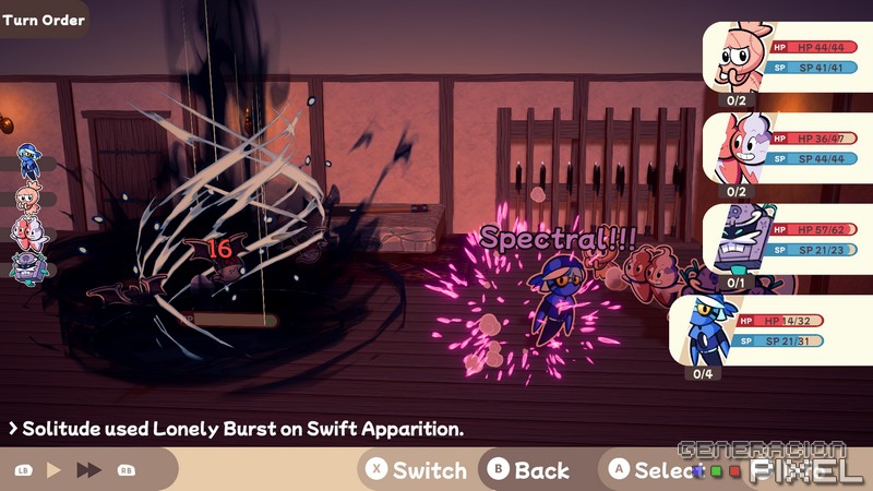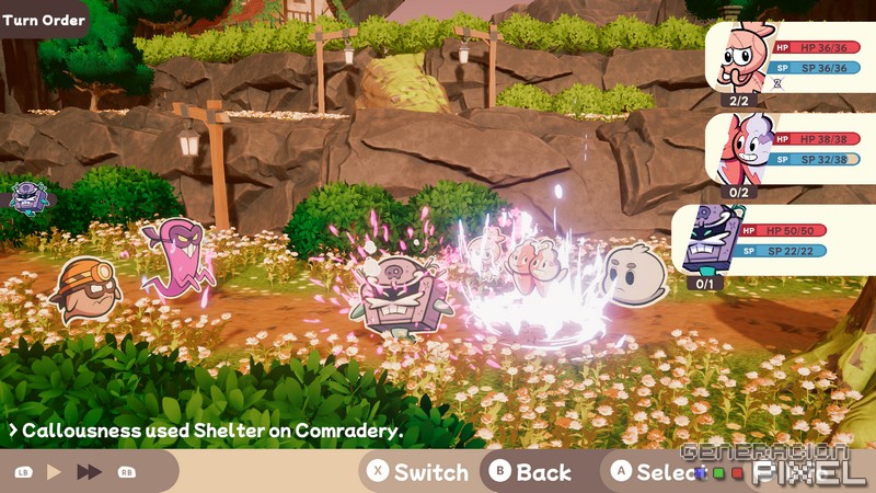 La parte del combate puede que sea lo más satisfactorio del juego. Encontrándome con un sistema de combates por turnos que se sabe variado y divertido. Y en el que la utilización de diferentes habilidades, la mejora y adquisición de estas, y ciertas especializaciones hacen que la experiencia estratégica sea muy variada según el camino que queramos tomar. Donde los variados enemigos, amigos, y mecánicas, se hacen ágiles dentro de esa línea temporal que irán mostrando el orden de combate y el camino hacia cada victoria.