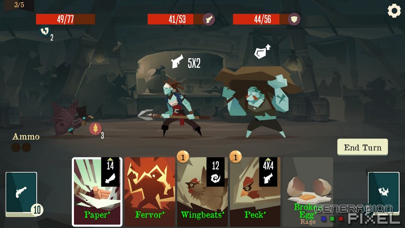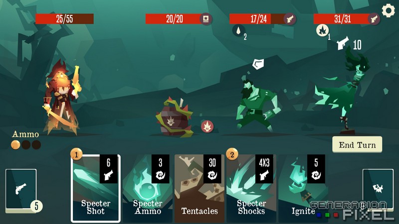 El combate se desarrolla de manera pausada y por turnos. Siendo claramente la esencia del juego. Y en el que contamos con una barra de energía y otra de munición para poder utilizar ciertas cartas que la requieren. Las cartas tienen una variedad realmente apabullante. Incluyendo algunas especiales para cada personaje, estando más que bien explicadas en cuanto a sus virtudes y carencias. Entre las cartas encontramos algunas de ataque, otras de defensa, e incluso de penalización. Pudiendo ampliar y mejorar nuestras cartas a medida que avancemos en la partida o en el juego en general. Sin embargo, debemos estar atentos, ya que nos enfrentamos al concepto de muerte perpetua, lo cual tendremos que tener en mente, y saber utilizar para nuestro aprendizaje.