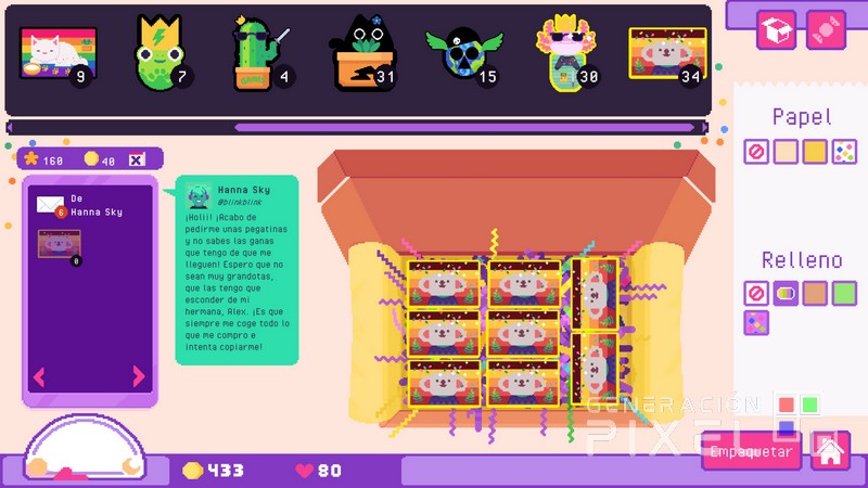 Una vez pasado los trámites creativos, toca entrar en la venta y gestión de estas. En un apartado donde comenzaremos a recibir pedidos de nuestro catálogo. Teniendo que dedicarnos a empaquetar estas en diferentes cajas en las que pondremos nuestros esmero para que tengan la más coqueta presentación interior, y cumplamos con todo lo que el pedido nos requiere, para su posterior envío. Siendo curioso como se ha incluido la posibilidad de poner detalles en forma de chucherías para agradecer la confianza de nuestros clientes. . E incluso una subida de nivel de cada objeto utilizado que aumenta el valor y en interés de las pegatinas.