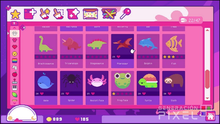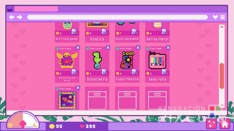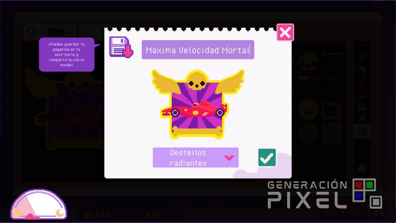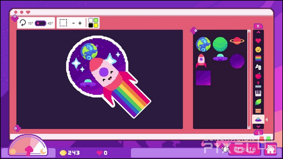 Una versión la cual mantiene el encanto respecto a la de PC, pero que sufre en uno de los aspectos principales, la implementación de los controles y la interfaz. Encontrando como se nota que el diseño base ha sido diseñado para ser jugado con un ratón, y la transición a la consola de Nintendo simplemente no es todo lo placentera que uno desearía. Y es que en vez de aprovechar la pantalla táctil de la Switch para permitir una experiencia más intuitiva, el juego opta por un sistema de control algo torpe y poco funcional, que limita el uso del cursor al área de edición, mientras que el acceso a otras funciones requiere combinaciones algo botones confusas. Cosa que lleva que a la hora de arrastrar y soltar pegatinas, cambiar sus tamaños y colores, y diseñar nuevas combinaciones debería no me termine de convencer.