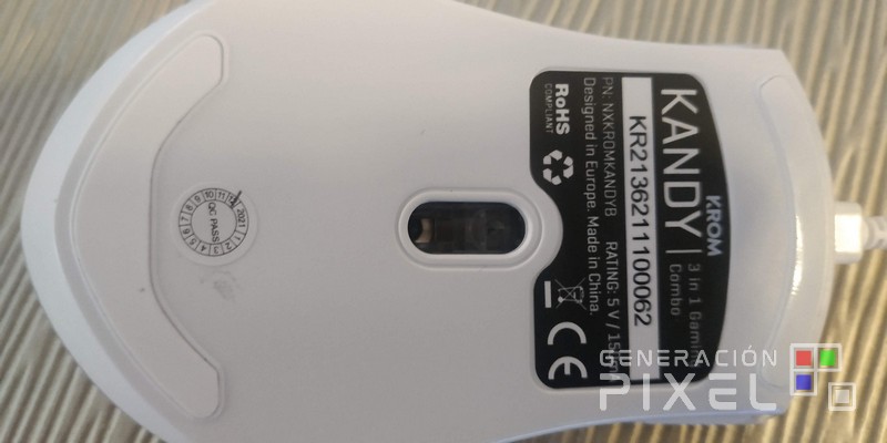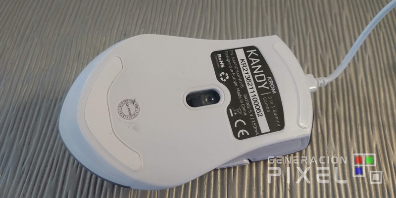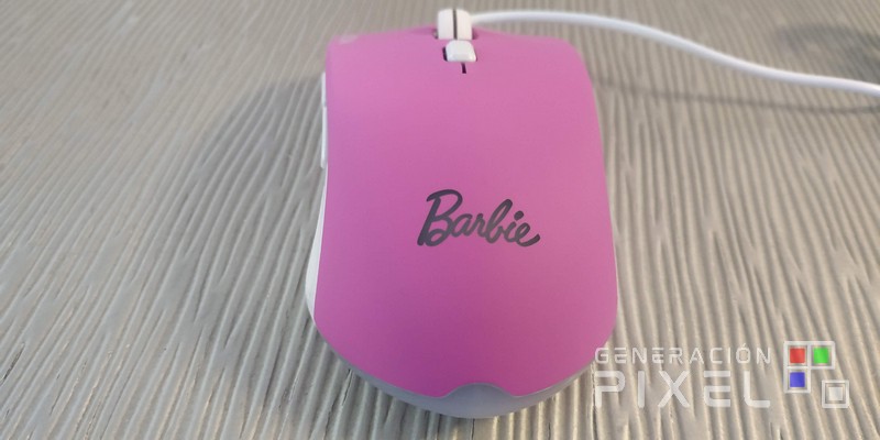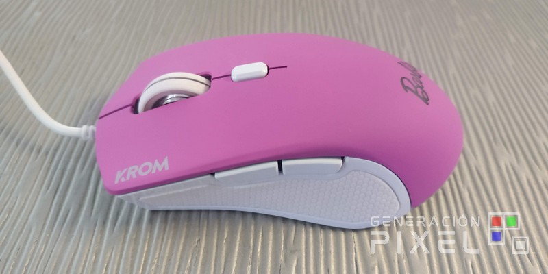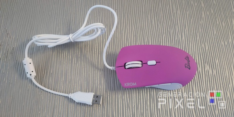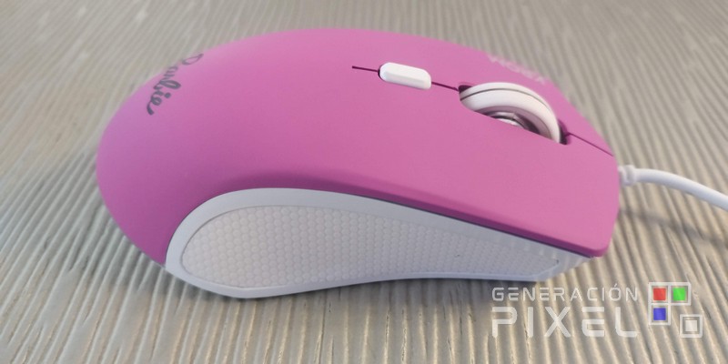 Por otro lado, el ratón mantiene esa estética rosa y blanca, con detalles de la marca y la franquicia, que se adorna con la inclusión led que le queda genial. Donde a su cuerpo plástico con cierta rugosidad, se le une una base lisa con algunos surfers, y un cable USB textil anti enredos y correcto en su maleabilidad de 1’5 m. Todo ello bajo un diseño ergonómico para todo tipo de agarres y tamaños de manos. Con una botonera clásica lateral y superior. Un rueda de agradable tacto. Y un pulsador para cambios de velocidad, con 4 niveles de DPI ajustables que alcanza hasta los 6400 DPI.