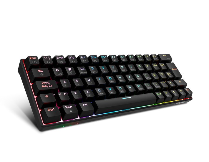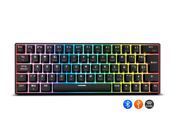 Krom presenta Kyara un teclado ultracompacto que permite ganar espacio en el setup o escritorio gracias a su formato 60%. Con este mini teclado mecánico inalámbrico con RGB no habrá enemigo que se resista. Con su tamaño compacto la comodidad está asegurada. Su tamaño lo hace el teclado mecánico mini perfecto para jugar, aunque también para estudiar o trabajar. Su cuidado diseño hace que se adapte perfectamente a cualquier setup. Podrás conectar este teclado mini mediante Bluetooth, 2.4 GHz o bien, a través de su cable de USB, que ofrece una mayor resistencia al paso del tiempo.